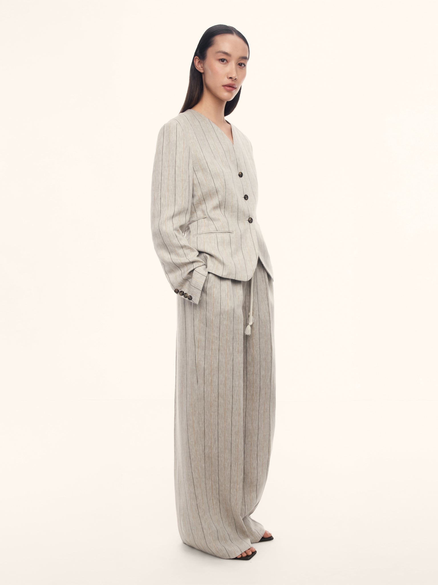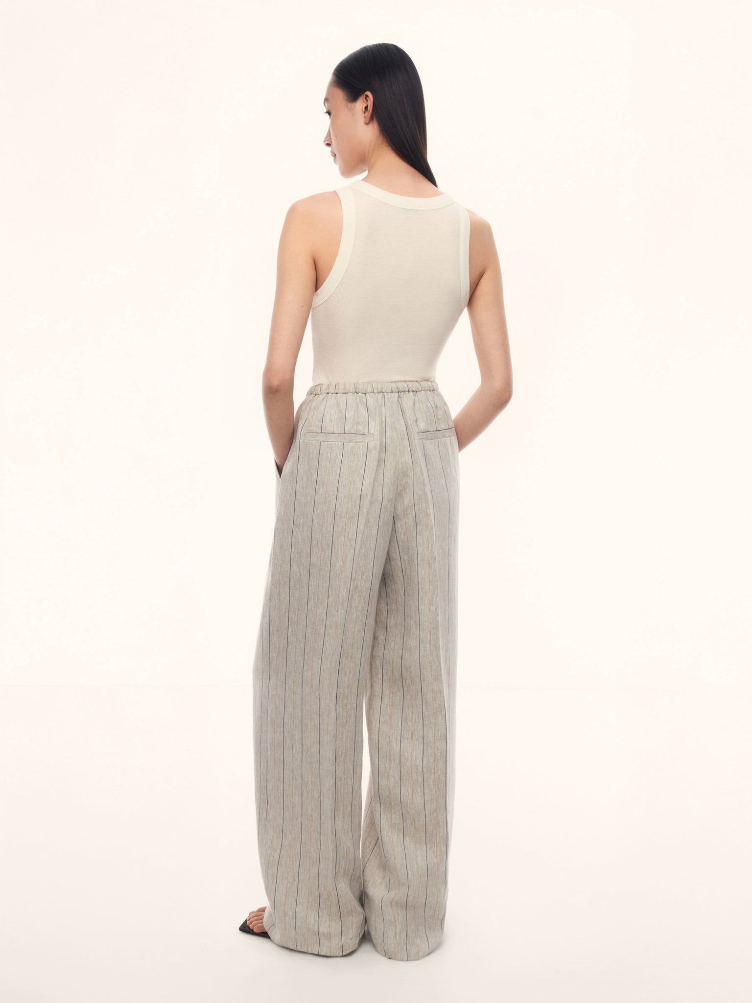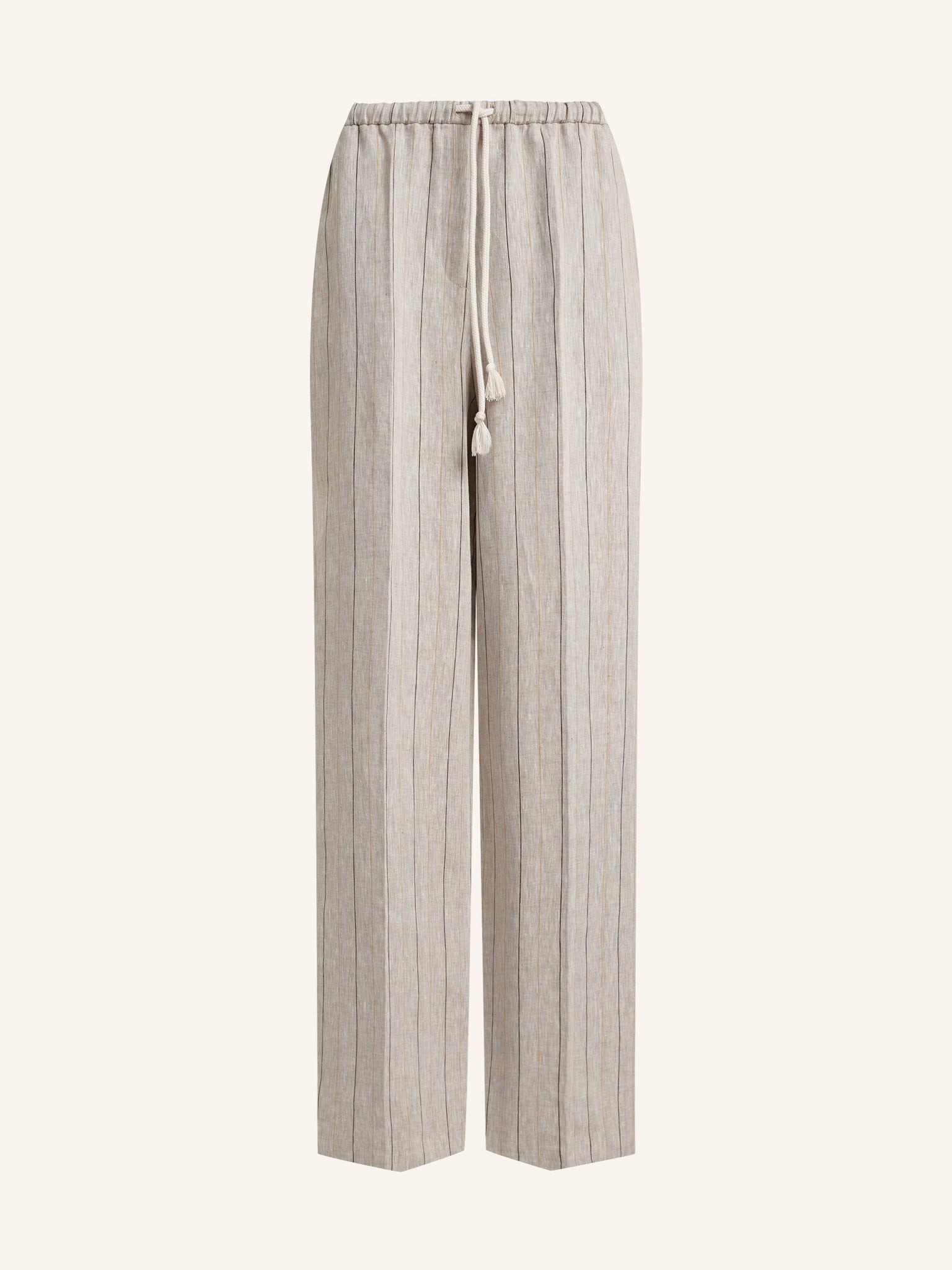1. Летние брюки из плотного льна — с комфортным поясом на резинке, который легко посадить по фигуре с помощью мягкого шнурка с кисточками